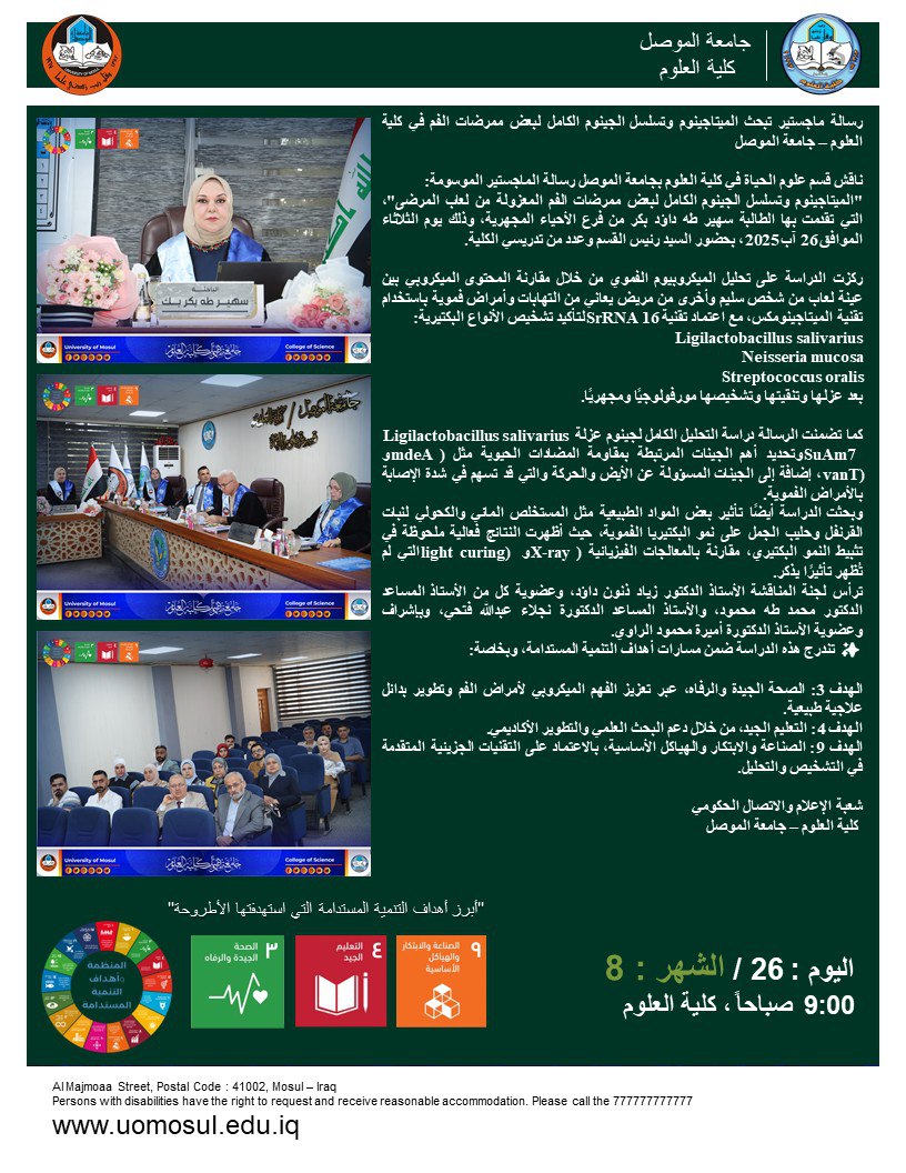 The Department of Biology at the College of Science, University of Mosul, discussed the Master’s thesis titled “Metagenomics and Whole Genome Sequencing of Selected Oral Pathogens Isolated from Patients’ Saliva”, submitted by Suheir Taha Dawood [Read More]