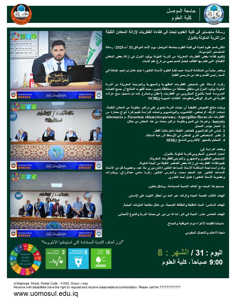 The Department of Biology at the College of Science, University of Mosul, discussed a master’s thesis entitled:“Immunological and Molecular Detection of Viruses Associated with Thalassemia Patients in Mosul City, Iraq”on Monday, September 1, 2025. The [Read More]