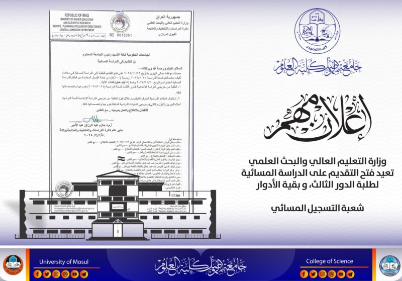 The College of science at the University of Mosul announces the opening of the application for evening study for the academic year 2025/2026 based on the approval of His Excellency the minister dated 19/11/2025, and [Read More]