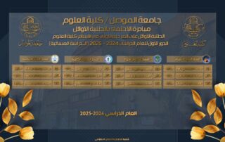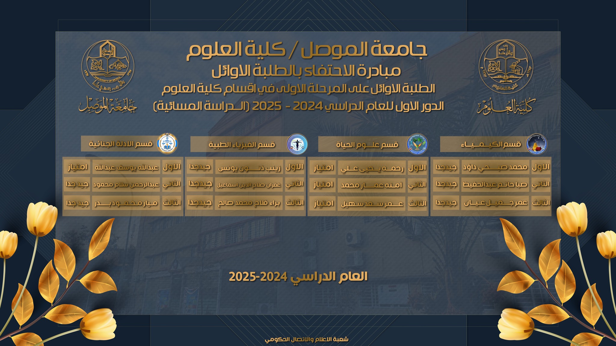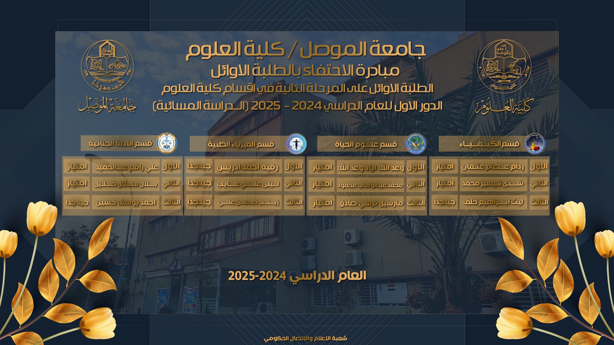 The College of Science – University of Mosul is pleased to announce, on Wednesday, July 23, 2025, the rankings of the top three students in the third year (evening study) for the academic year 2024–2025. [Read More]