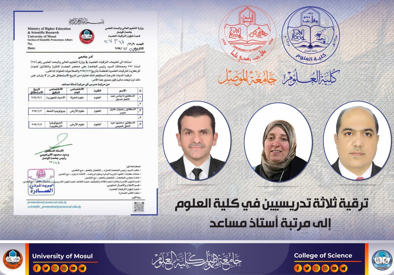 The journey of dedication and scientific advancement continues at the College of Science – University of Mosul, as the college proudly announces the promotion of three of its distinguished faculty members to the academic rank [Read More]