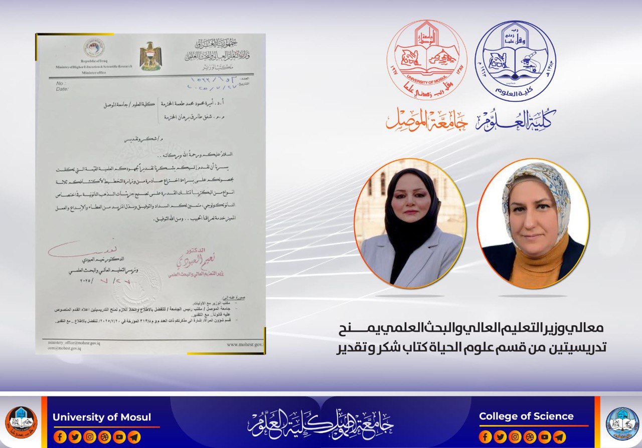 The Minister of Higher Education and Scientific Research, Dr. Naeem Al-Aboudi, has awarded Letters of Appreciation to Prof. Dr. Ameera Mahmood Mohammed Tu’ma Al-Rawi and Dr. Shafaq Tareq Burhan from the Department of Biology at [Read More]