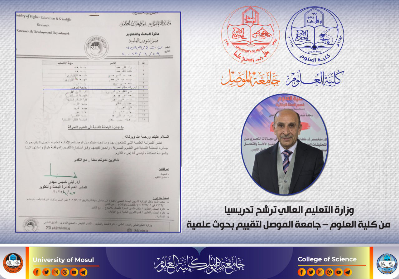 The Ministry of Higher Education and Scientific Research has nominated Prof. Dr. Raed Salem Al-Saffar, faculty member at the College of Science – University of Mosul and Head of the Department of Forensic Evidence, to [Read More]