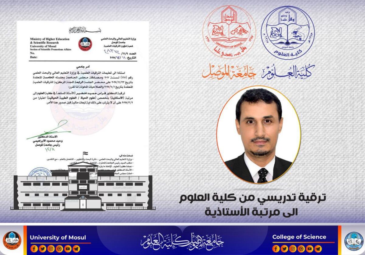 On Tuesday morning, December 9, 2025, the Department of Biology sciences at the College of science at the University of Mosul held a scientific seminar for doctoral student Ikhlas Ramadan Matar, in the Hall of [Read More]