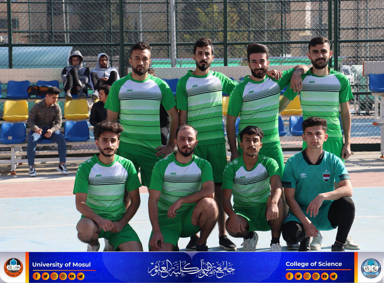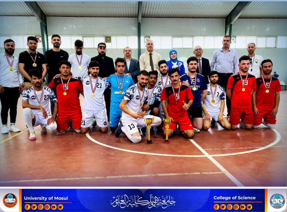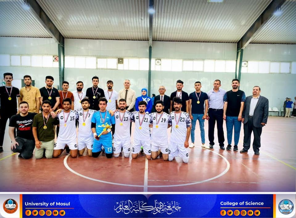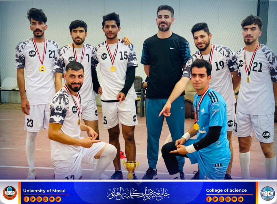 The College of Science futsal team has qualified for the final stages after a valuable 5–0 victory over the College of Medicine. Our heroic players delivered an outstanding performance that was well received by the audience. With this win, along with their previous victory over the College of Administration and Economics, our team is now among the six colleges competing in the final round of the University of Mosul Futsal League.
