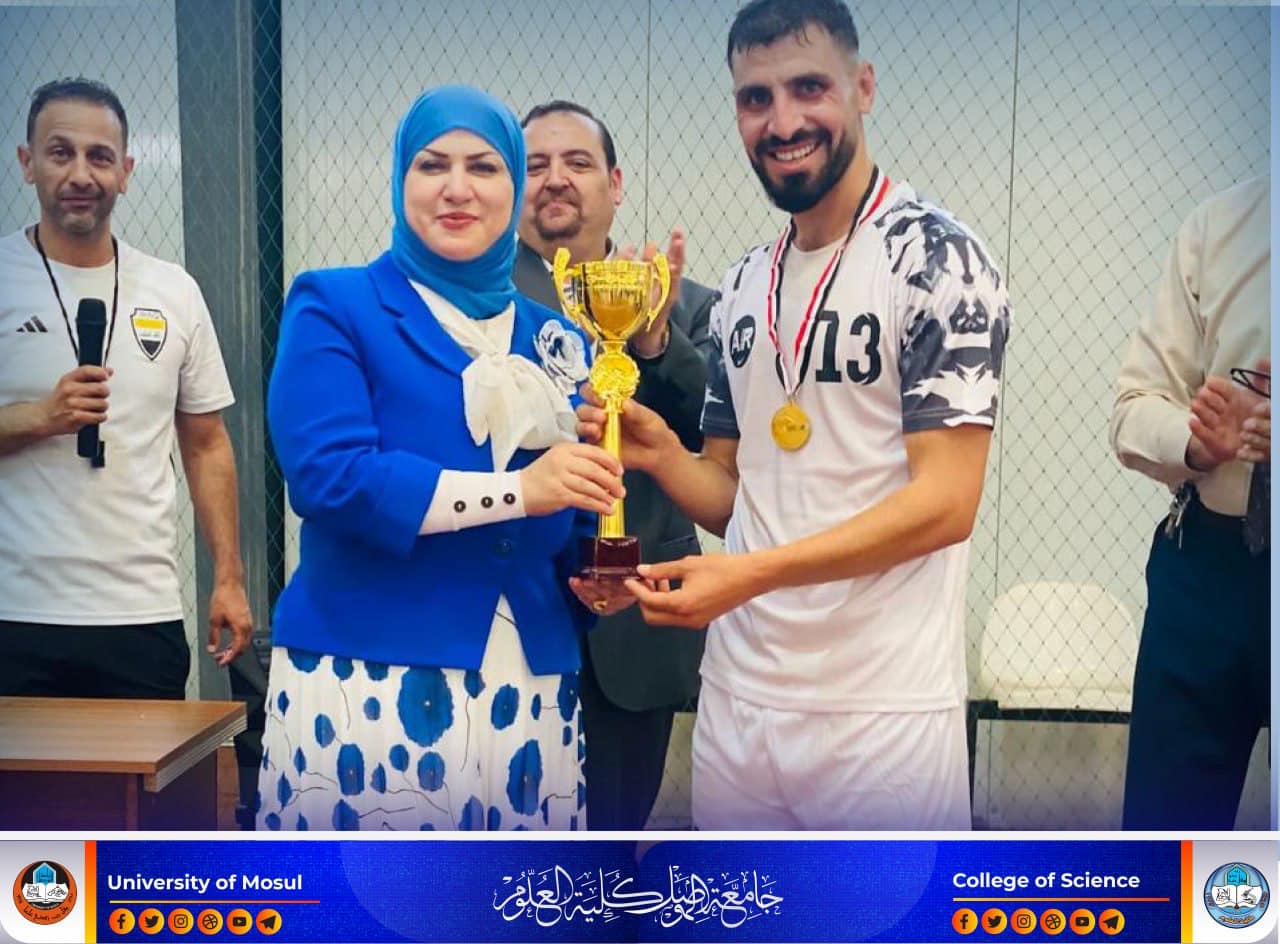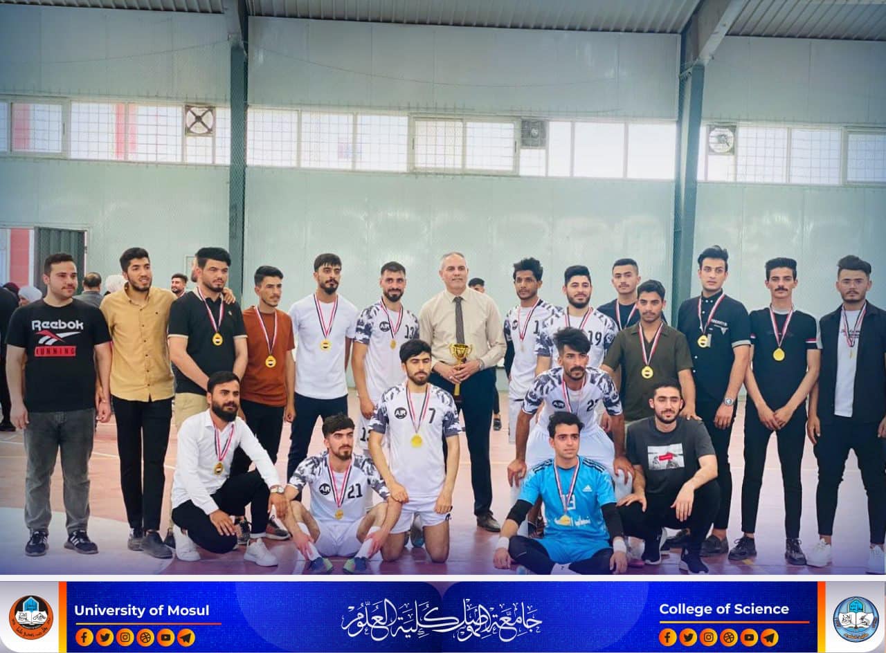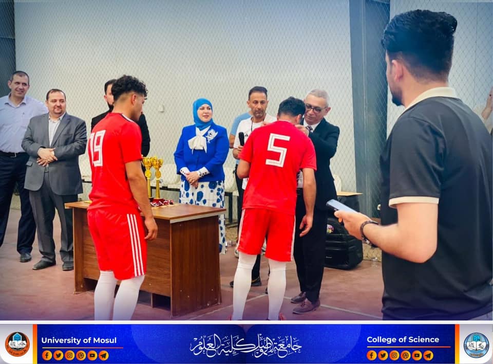 The College of Science futsal team has qualified for the final stages after a valuable 5–0 victory over the College of Medicine. Our heroic players delivered an outstanding performance that was well received by the audience. With this win, along with their previous victory over the College of Administration and Economics, our team is now among the six colleges competing in the final round of the University of Mosul Futsal League.