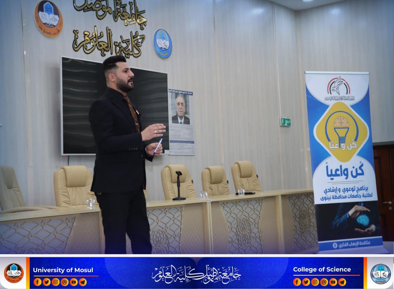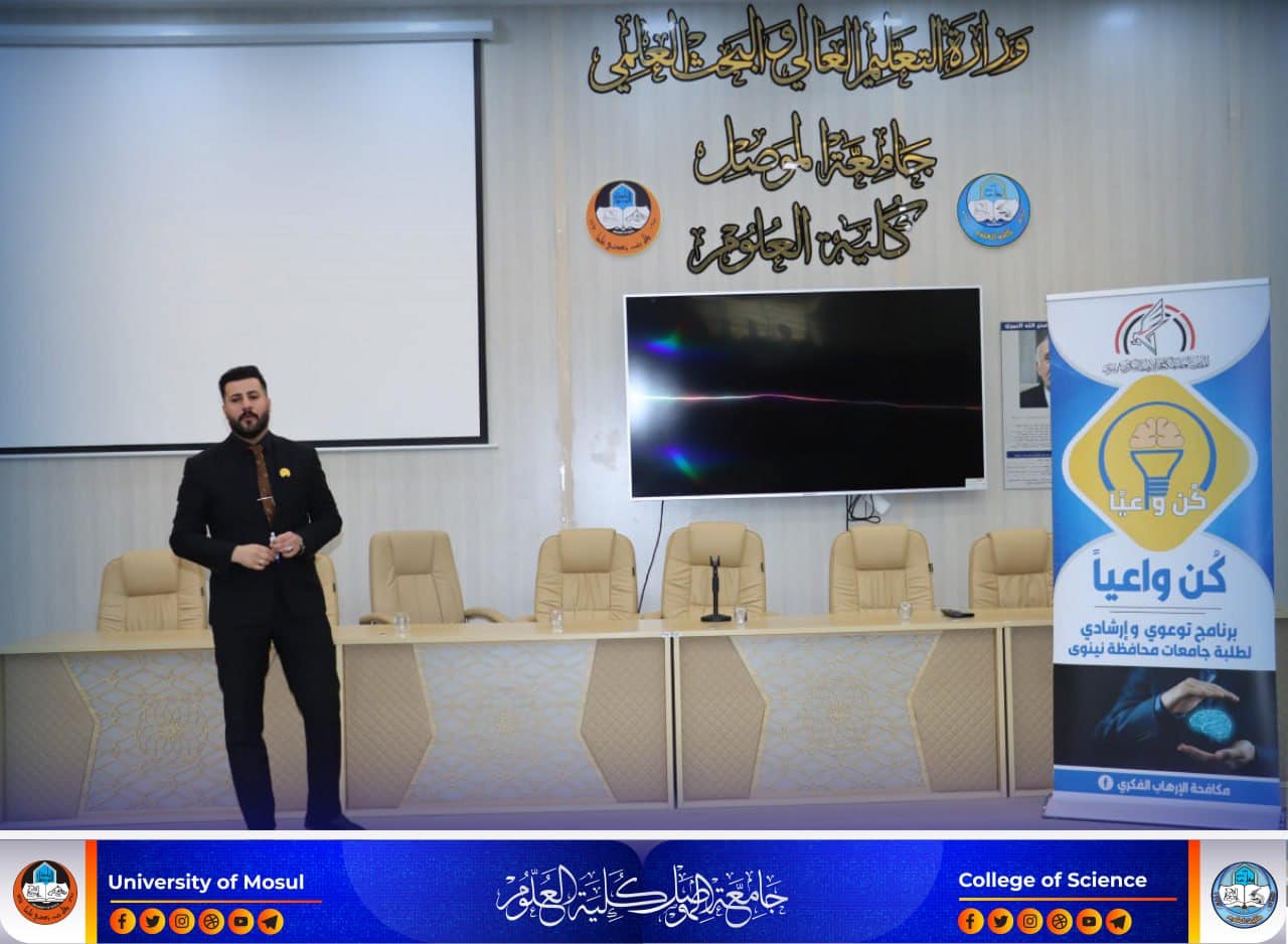 Under the patronage of the respected President of the University of Mosul, Prof. Dr. Waheed Mahmoud Al-Ibrahimi, and the supervision of the esteemed Dean of the College of Science, Prof. Dr. Hiyam Adel Ibrahim, and within the framework of enhancing intellectual awareness and mental safety among students in Nineveh governorate universities and shielding them from foreign and deviant ideas, the Nineveh Directorate for Combating Intellectual Terrorism launched its awareness and cultural program titled “Be Aware” with the slogan “Awareness is the Foundation of Knowledge.”