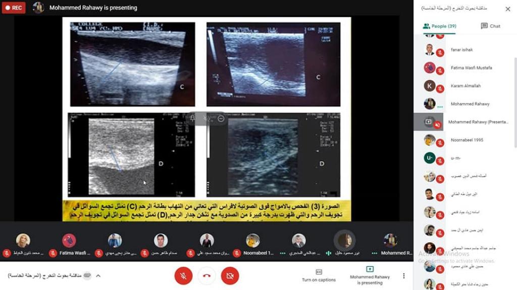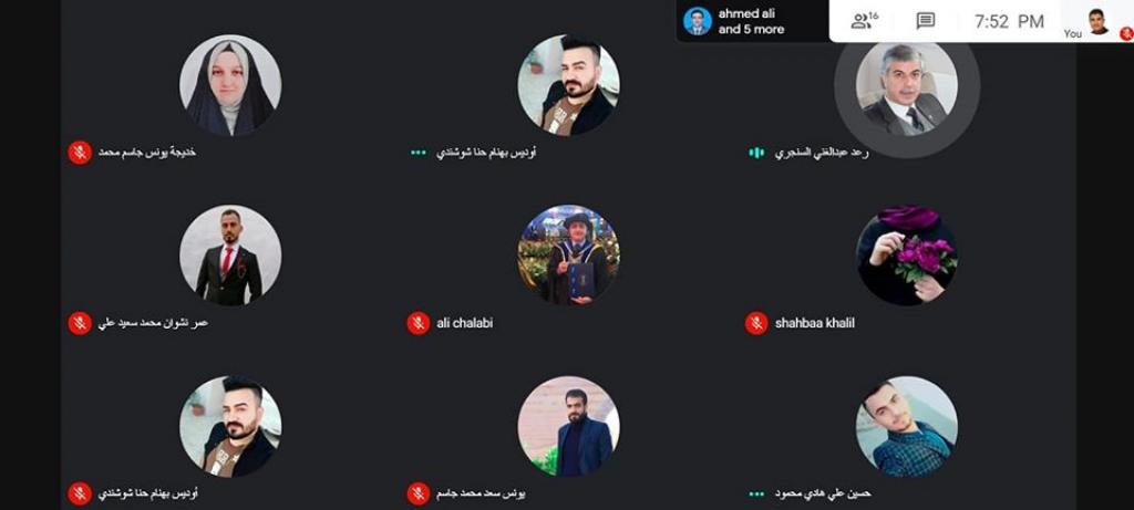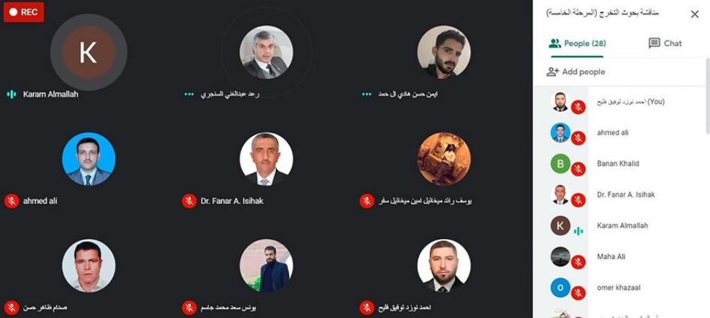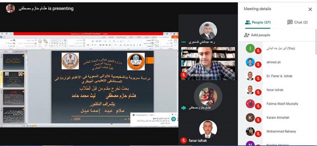 At the end of the academic year 2019-2020, the College of Veterinary Medicine has started to discuss graduation projects for the students in the fifth year, which is a part of the requirements for obtaining a bachelor’s degree.The research seminars were presented by 43 students who completed their project and divided into 20 seminars by using Google Hangouts Meet.Following the seminars, the students were examined by: -Professor Dr. Raad Abdulghani Basheer as achairman.Assist. Professor Karma Al-Mallah as a member.Assist. Professor Fanar Ablahad Isihak as a member.Assist. Professor Ahmed Khalaf Ali as a member.Lecturer Sadam Dhahir Hassan Ali as a member.The Dean of the College of Veterinary Medicine, Prof. Dr. Dhafer Muhammad Aziz would like to express profoundthanksand appreciation to the committee and supervisors, and also congratulates the students how completed their graduation projects.
