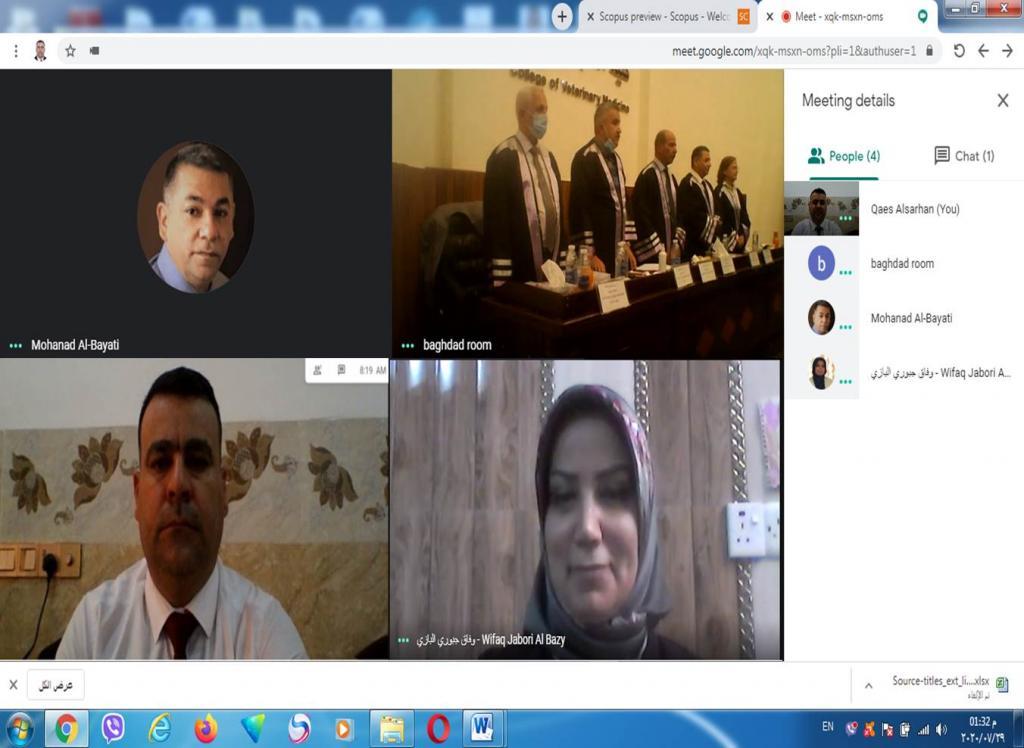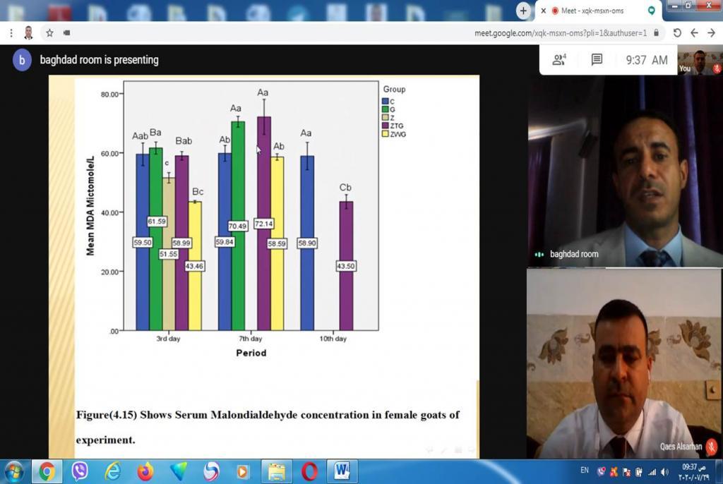 On Wednesday, 29thJuly 2020, Assist. Prof. Dr. Qaes Talb Shukur Alsarhan from Department of Internal and Preventive Veterinary Medicine, College of Veterinary Medicine participated in an online examining doctorate at College of Veterinary Medicine, University of Baghdad. Dr. Qaes discussed the doctoral thesis of the student Amer M. Abed entitled “Evaluation the Role of Olive Leaves Zinc OxideNanoparticles in alleviating Renal Dysfunction Induced by Gentamycin in Goats”.