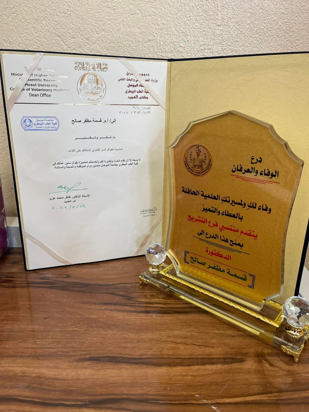 The Dean of the College of Veterinary Medicine, Prof. Dr. Dhafer Muhammad Aziz, honoured one of our academic staff in the Department of Anatomy, Assist. Professor Dr. Qismat, on the end of their service period and retirement occasion.The Dean of the College of Veterinary Medicine said in a speech during the ceremony organized by Department of Anatomy, “we express our thanks and appreciation for the efforts of Dr. Qismatin serving our primary students and by graduating generations referred to as excellence, noting that the doors of the college will remain open to her consultations and constructive ideas.