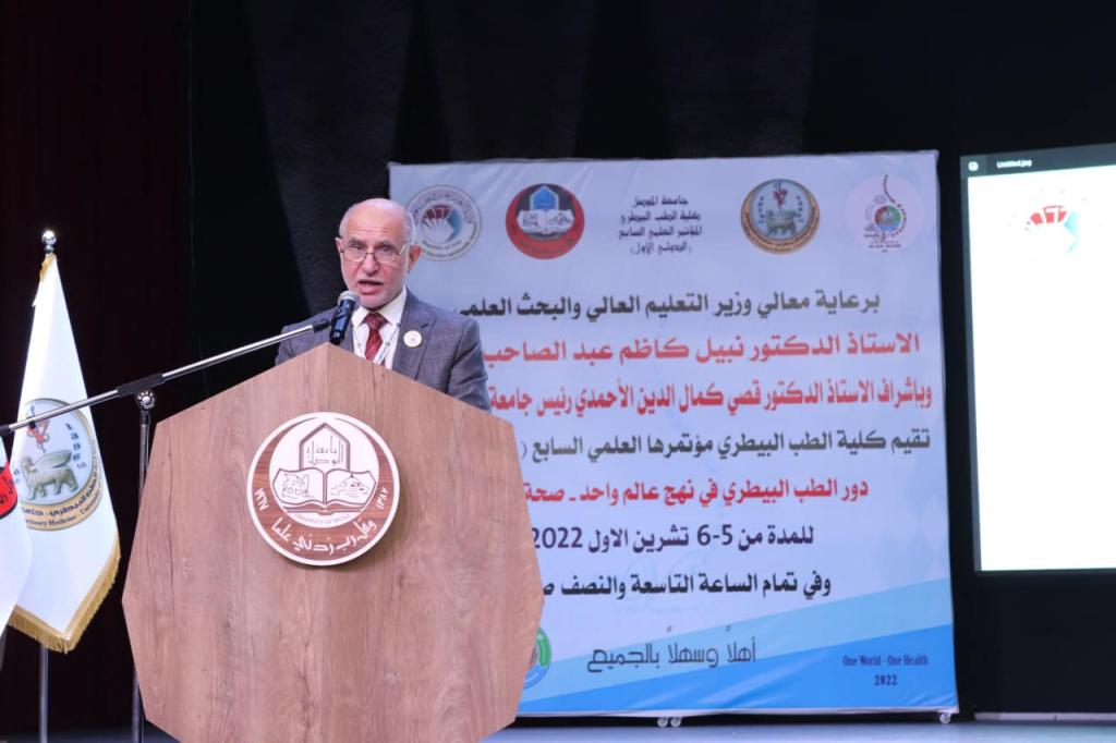 Under the patronage of Minister of Higher Education and Scientific Research, Dr. Nabeel Kadim Abid Al-Sahiband and under the supervision of the President of University of Mosul Prof. Dr.Qusay Kamaladdin Al-Ahmady. The College of Veterinary Medicine held its Seventh (First International) Scientific Conference under the theme: “The Role of Veterinary Medicine in the Approach One World-One Health”. This Conference held between the 5thand 6thof October 2022. This conference aimed to bring together researchers and veterinarians to provide updates in research, information, and and exchange ideas about the current research issues of concern to veterinary and public health.The conference consisted of 2 days’ sessions in which many national and international presenters delivered their presentations parallel to a veterinary medicine materials companies exhibition.