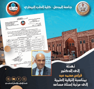 Dr. Firas Mohammed Abdul (Department of Pathology and Poultry Diseases) on his promotion to the rank of Assistant Professor.