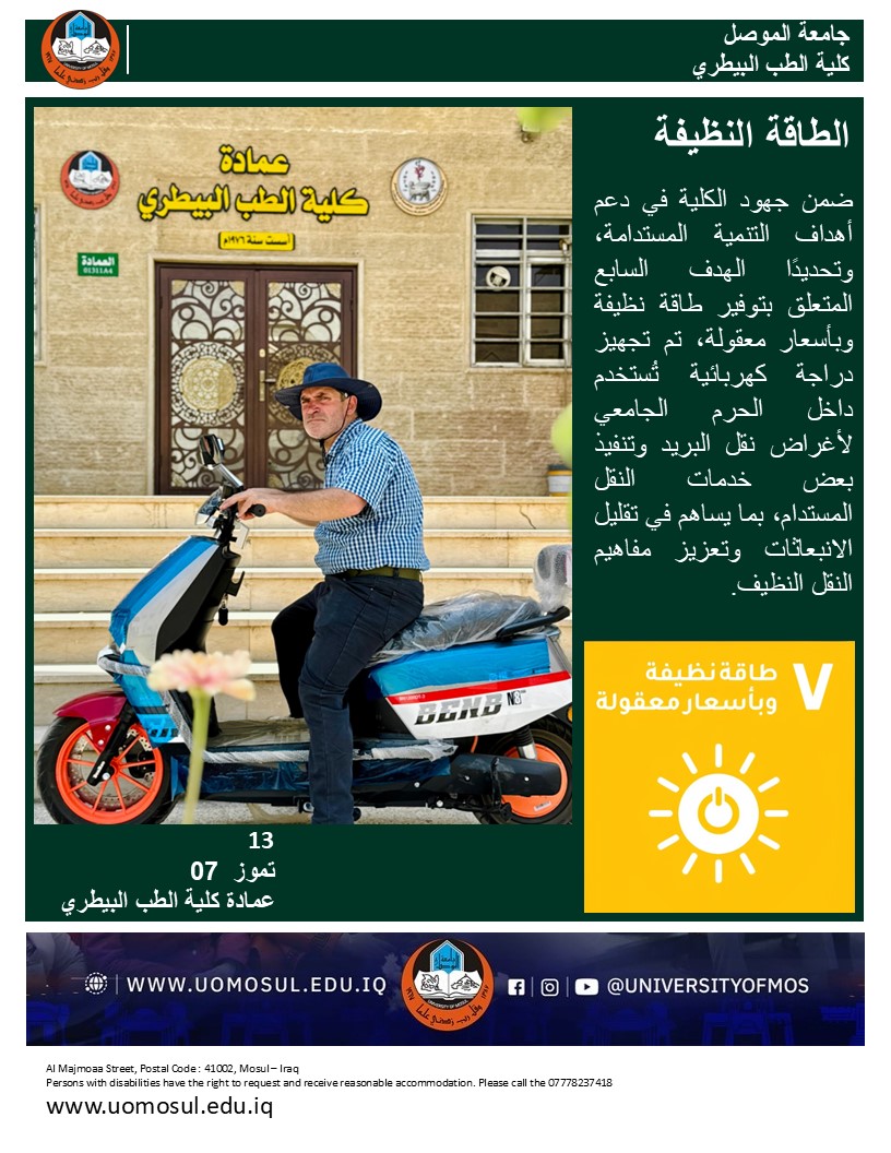 As part of the college’s efforts to support the Sustainable Development Goals, specifically Goal 7 related to affordable and clean energy, an electric bicycle has been provided for use within the university campus. It serves purposes such as mail delivery and implementing certain sustainable transport services, contributing to reduced emissions and promoting the concept of clean transportation.