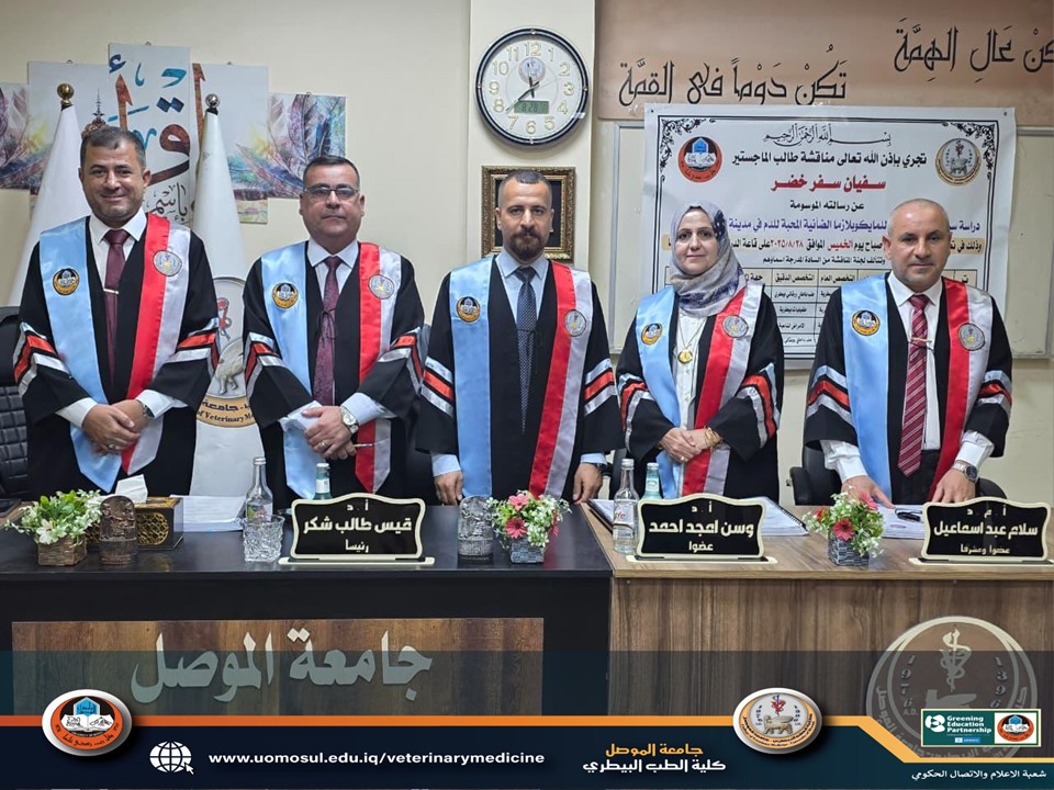 The College of Veterinary Medicine, University of Mosul, held a master’s thesis defense entitled “A Clinical and Diagnostic Study of Hemotropic Mycoplasma in Sheep in Mosul City, Iraq”, presented by Sufyan Safar Khudhur (Veterinary Internal and Preventive Medicine) on Thursday, August 28, 2025.
