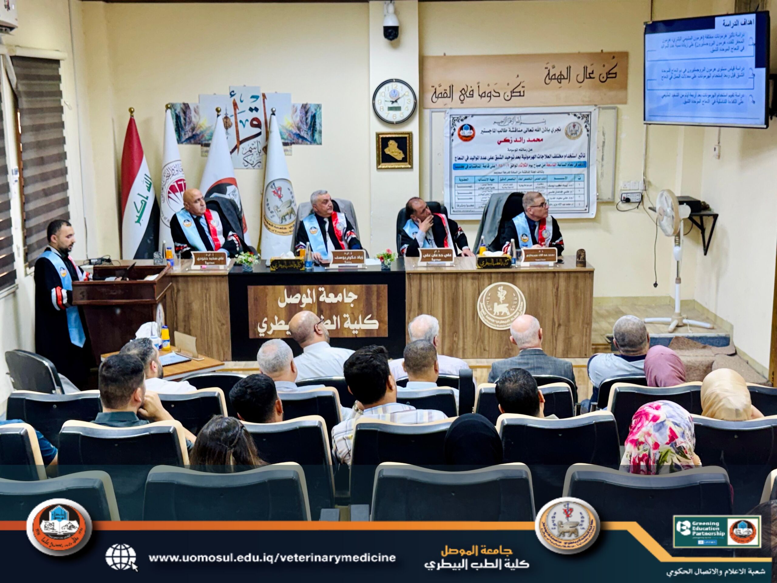 A master’s thesis defense was held at the College of Veterinary Medicine, University of Mosul, Department of Surgery and Animal Reproduction, titled “The Effect of Using Different Hormonal Treatments after Estrus Synchronization on the number of births in ewes” by student Mohammed Raed Zaki, under the supervision of Prof. Dr. Mohammed Abdul-Ilah Aziz, on Tuesday, October 7, 2025.