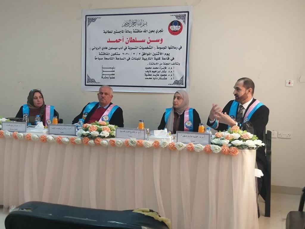 a Viva defence held at the department of Arabic, College of Education for , the MA candidate Wassan Sultan Ahmed defended her thesis. The Dean of the college Prof. Dr. Dhumyaa Abdullah attended the event.The discussion committee consisted of the professors: