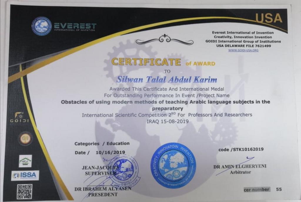 The President of the University of Mosul Qusay Al-Ahmedy honors Asst. Lecturer Mr. Silwan Talal, a teacher in the Department of Physical Education and Sports Sciences, with a letter of thanks for his distinguished efforts in completing the research marked ((Obstacles to the Use of Modern Methods for Teaching Arabic Language Courses for the Preparatory Stage)), which was held in the second international scientific competition for academics and researchers set by the Foundation Everest of America for Creativity, Innovation .