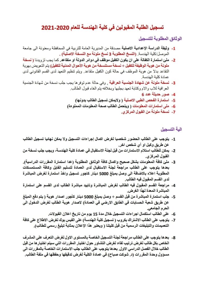اعلان الى الطلبة المقبولين في كلية الهندسة للعام الدراسي 2021/2020