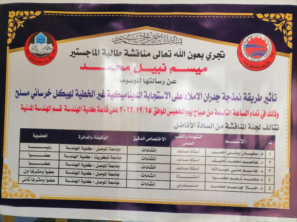تمت مناقشة رسالة ماجستير في قسم الهندسة المدنية / جامعة الموصل بتخصص هندسة الانشاءات، بعنوان “تأثير طريقة نمذجة جدران الاملاء على الاستجابة الديناميكية غير الخطية لهيكل خرساني مسلح” للطالبة ميسم نبيل محمد وإشراف مشترك من الاستاذ الدكتور محمد نجم محمود والدكتورة حلا جاسم محمد في يوم الخميس الموافق 15/12/2022.