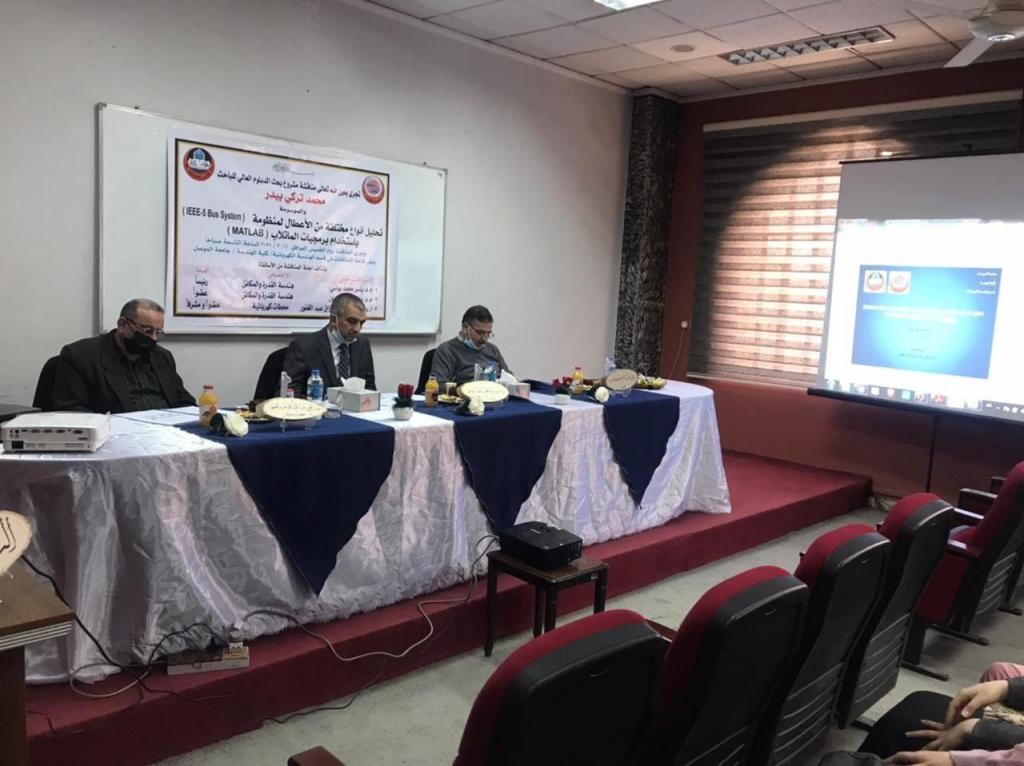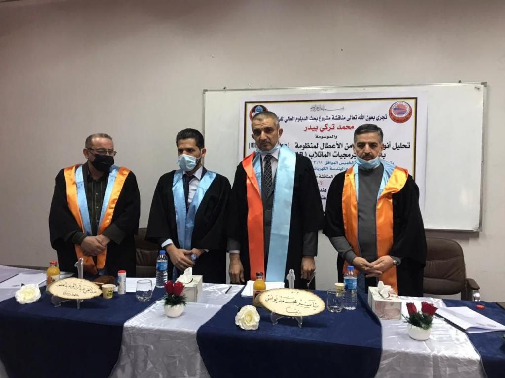 جرت في قسم الهندسة الكهربائية في كلية الهندسة بجامعة الموصل مناقشة بحث الدبلوم العالي المقدم من الطالب محمد تركي بيدر تحت عنوان (تحليل انماط مختلفة من الاعطال لمنظومة IEEE-5 فيbus system باستخدام برمجيات الماتلاب Matlab)من قبل لجنة يرأسها المدرس الدكتور ياسر محمد يونس وتضم المدرس الدكتور وائل هاشم حمدون عضوا والاستاذ الدكتور عبد الغني عبد الرزاق عبد الغفور عضوا ومشرفا .