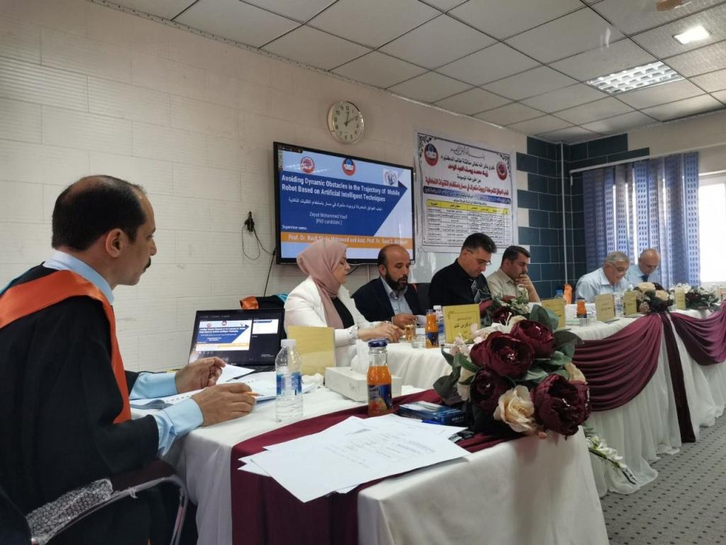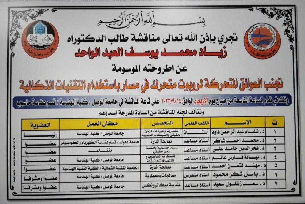 تمت مناقشة اطروحة دكتوراة في صباح اليوم الاربعاء الموافق 14-9-2022 في تمام الساعة التاسعة صباحا وعلى قاعة المناقشات في قسم هندسة الميكاترونكس. الاطروحة بعنوان “تجنب العوائق المتحركة لروبوت متحرك في مسار باستخدام التقنيات الذكية” مقدمة من قبل طالب الدكتوراه في قسم هندسة الحاسوب زياد محمد يوسف جرجيس، وهو احد تدريسي قسم هندسة الميكاترونكس.