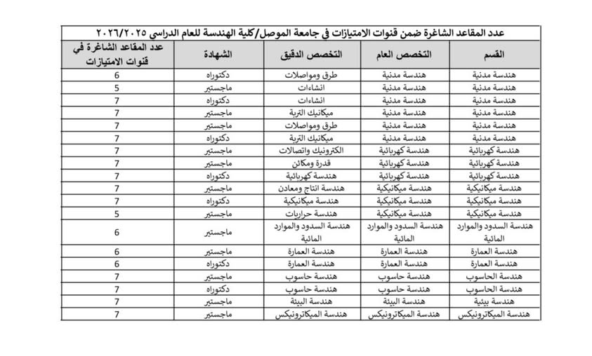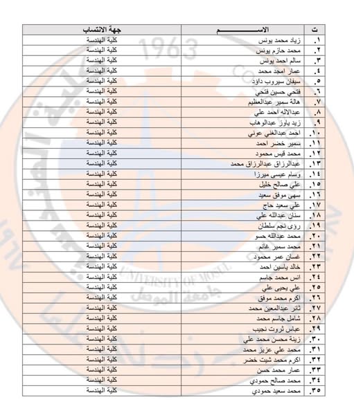 • إلى الطلبة المقبولين في كلية الهندسة بجامعة الموصل للعام الدراسي 2026/2025 . ترحب عمادة كلية الهندسة بطلبتها الاعزاء المقبولين في الكلية للعام الدراسي 2026/2025 وتدعوهم [إقرأ المزيد]