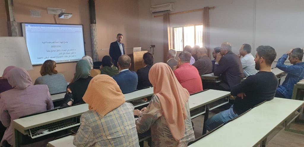بتاريخ ١٤/ ١١/ ٢٠٢٢ اجتمعت الهيئة العامة لقسم هندسة البيئة لمناقشة الامور الخاصة بدوام المستوى الأول والاهتمام بالعمل البحثي ومتابعة الاعتماد المؤسسي والتصنيف الوطني بالاضافة الى تطوير القسم من حيث الاستدامة .