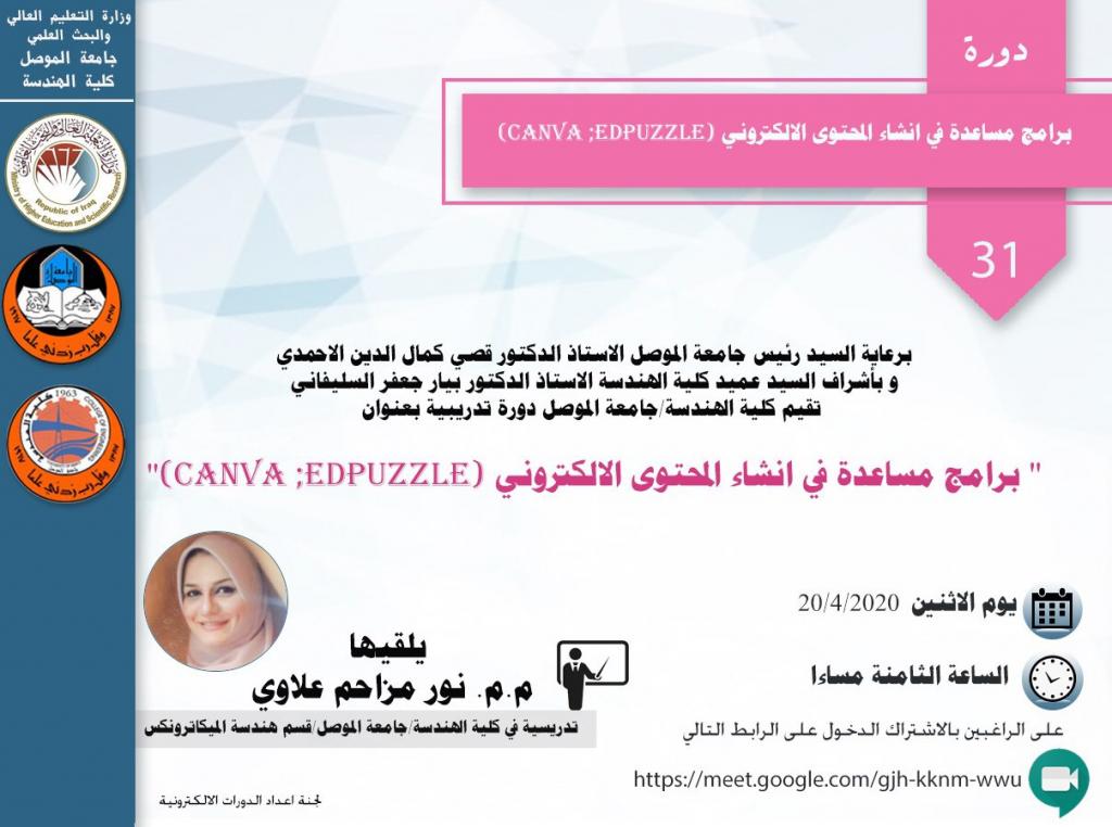 2. دورة تدريبية عن برامج مساعدة في انشاء المحتوى الالكتروني (canva ;edpuzzle) يلقيها م.م. نور مزاحم علاوي في تمام الساعة 8:00 مساء. تتضمن الدورة شرح برنامح edpuzzle لتصميم وتعديل الفيديوهات التعليمية واضافة الأسئلة وكذلك شرح برنامج ال canva التصميمي.