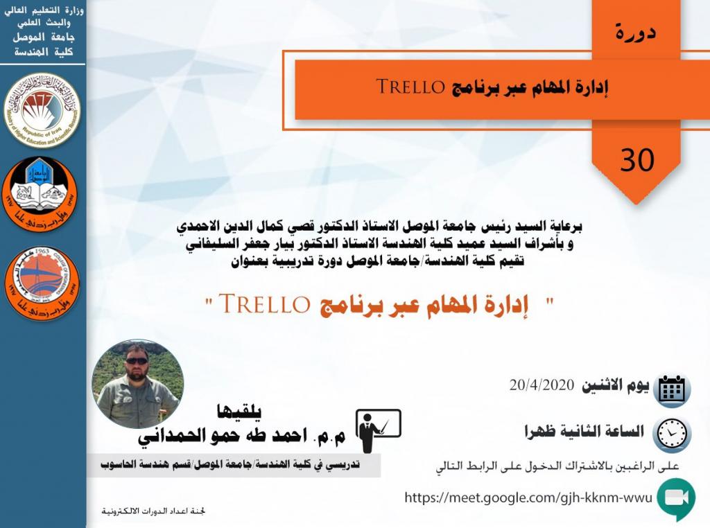 1. دورة تدريبية عن إدارة المهام عبر برنامج Trello يلقيها م.م. احمد طه حمو الحمداني في تمام الساعة 2:00 ظهرا. تتضمن الدورة تعريفاً بهذا البرنامج و كيفية استخدامه في إدارة المهام سواءً على المستوى الشخصي أو على مستوى المؤسسات الصغيرة والكبيرة وأثره في تنسيق العمل واختصار الوقت والجهد ، وتتضمن الدورة مثالاً عملياً يتم من خلاله تنفيذ اغلب الوظائف التي يقوم بها هذا البرنامج.