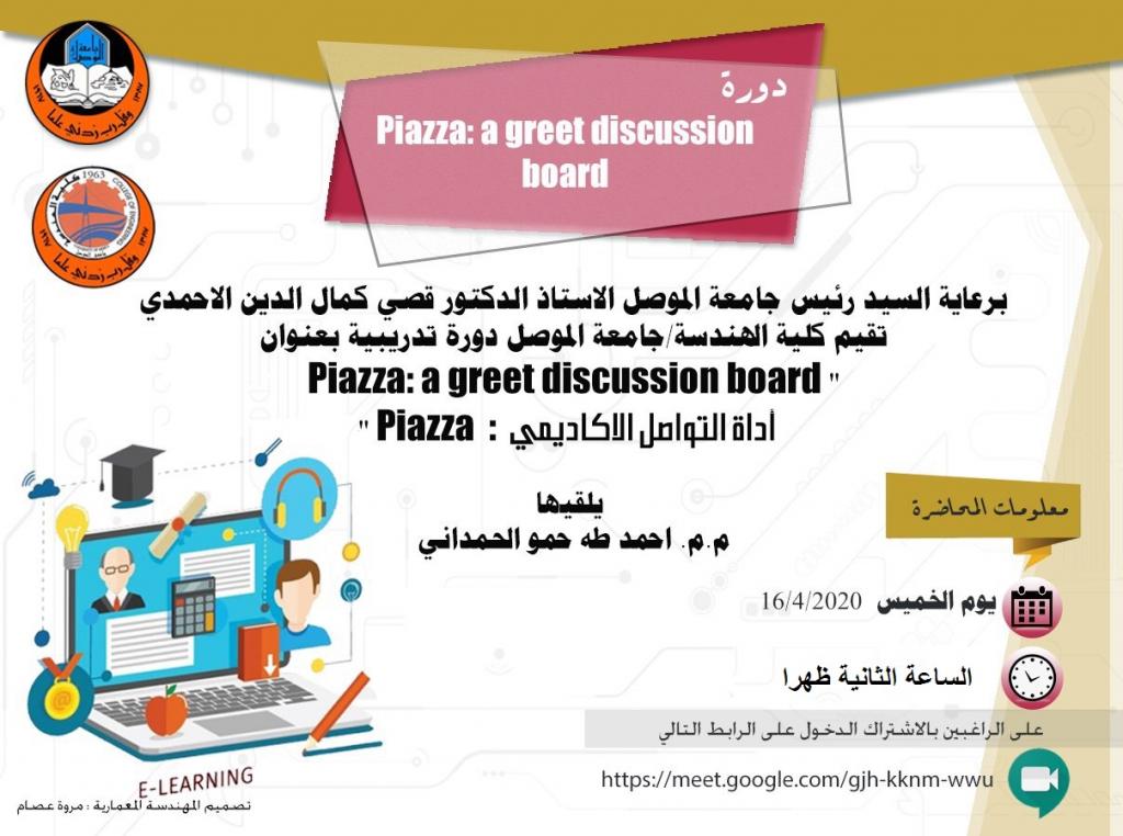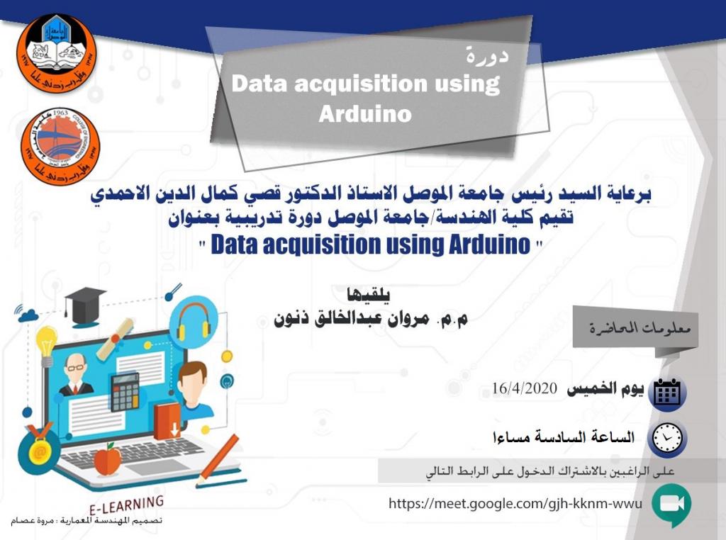 1- دورة تدريبية عن (منصة النقاش التعليمية PIAZZA) يلقيها م.م. أحمد طه حمو في تمام الساعة 2:00 مساء. تتضمن الدورة تعريفاً بهذه المنصة و أهم الخصائص التي تميزها عن اقرانها في المحتوى الالكتروني من ثم انشاء صف الكتروني عبر موقعها على الانترنت و استعراض لأبرز الخيارات المتاحة لإنتاج بيئة تفاعلية مثالية بين الاستاذ و طلبته.2- دورة تدريبية عن Data acquisition using Arduino يلقيها م.م. مروان عبدالخالق ذنون في تمام الساعة 6:00 مساء. تتضمن الورشة تطوير التجارب العملية في مختبرات اقسام كلية الهندسة باستخدام المسيطر الدقيق (Arduino) باقل تكلفة ممكنة واستخدام برنامج MATLAB ولوح Arduino لتوضيح عملية نقل البيانات (Data transmission) وذلك لاستخدامها للأغراض التعليمية.