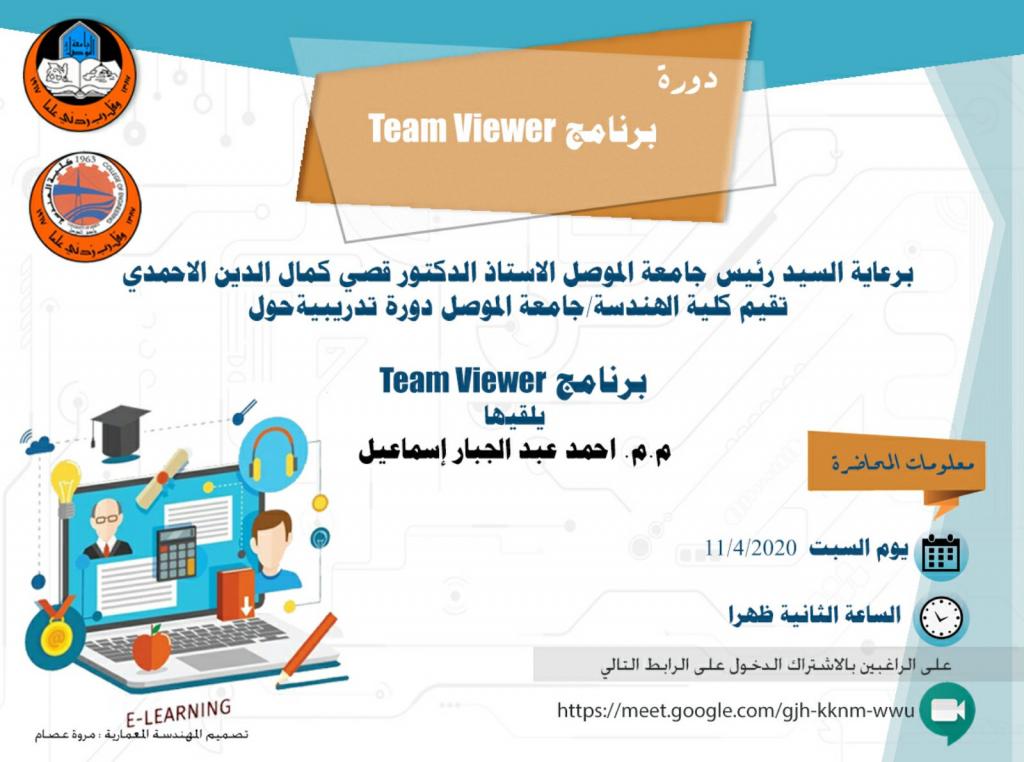 – دورة تدريبية حول برنامج Team Viewer يلقيها م.م. احمد عبد الجبار إسماعيل في تمام الساعة 2:00 بعد الظهر.
