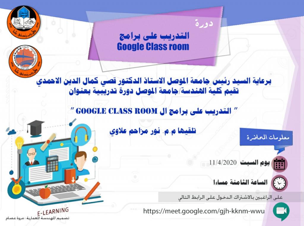 – دورة عن التدريب على برامج ال Google Class room تلقيها م.م. نور مزاحم علاوي في تمام الساعة 8:00 مساء.