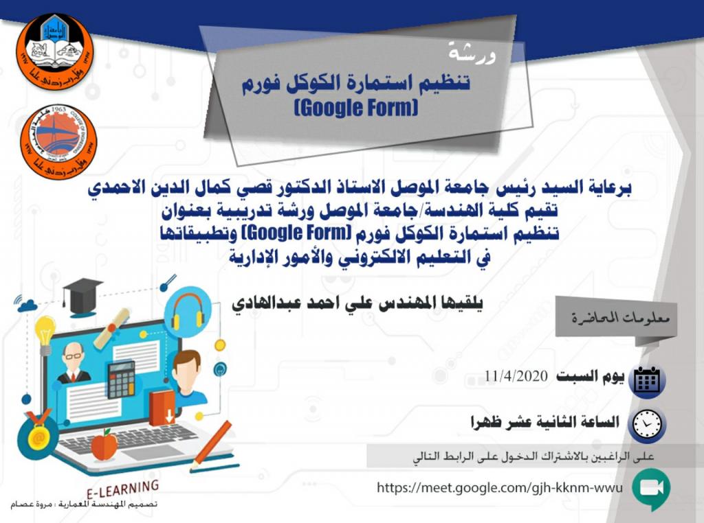 – دورة عن تنظيم استمارة الكوكل فورم (google form) وتطبيقاتها في التعليم الالكتروني والأمور الإدارية يلقيها المهندس علي احمد عبد الهادي في تمام الساعة 12:00 ظهرا. https://meet.google.com/gjh-kknm-wwu