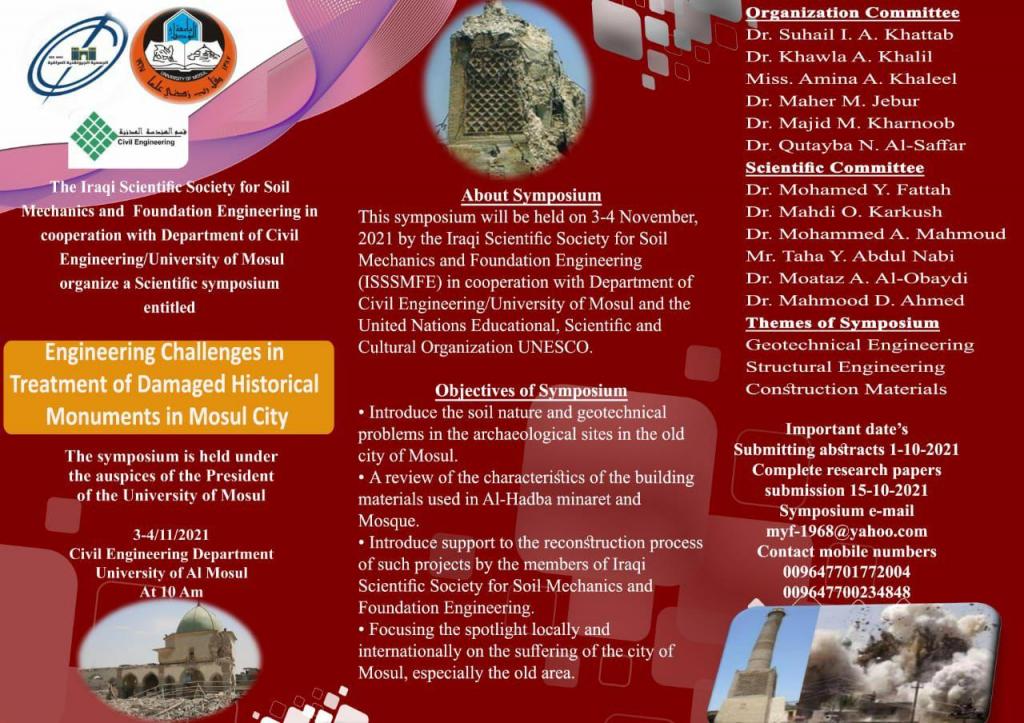 برعاية السيد رئيس جامعة الموصل (الأستاذ الدكتور قصي كمال الدين الأحمدي) المحترم يقيم قسم الهندسة المدنية /كلية الهندسة/جامعة الموصل وبالتعاون مع الجمعية العلمية العراقية في ميكانيك التربة وهندسة الاسس ومنظمة الأمم المتحدة للتربية والعلوم والثقافة (اليونسكو) ندوته العلمية الأولى للعام الدراسي (2021-2022) بعنوان (التحديات الهندسية في التعامل مع المعالم التأريخية المتضررة في مدينة الموصل) بتاريخ 4/11/2021-3 وعلى أروقة قسم الهندسة المدنية.