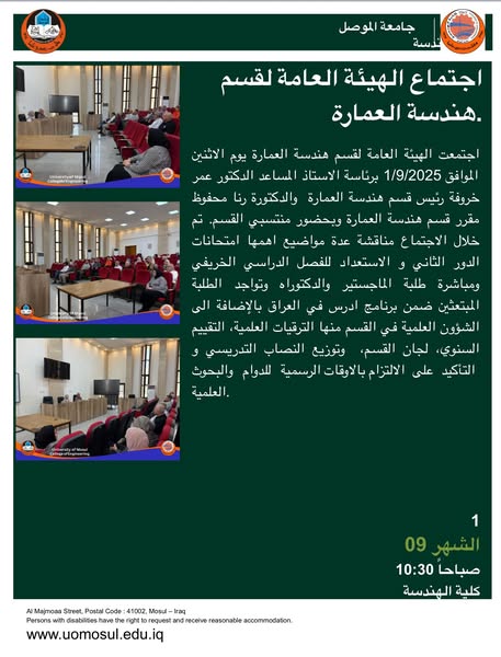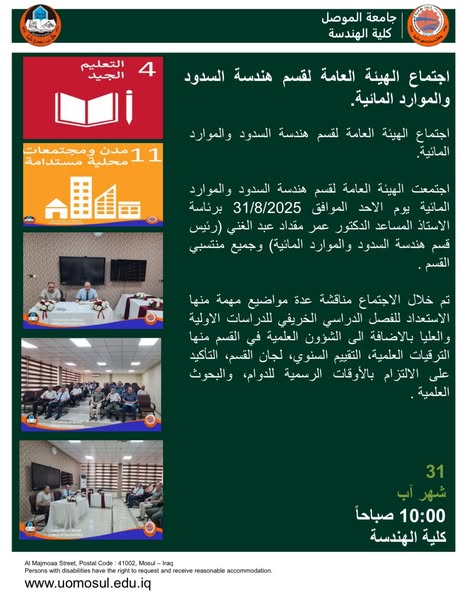 اجتمعت الهيئة العامة لقسم هندسة السدود والموارد المائية يوم الاحدالموافق 2025/8/31 برئاسة الاستاذ المساعد الدكتور عمر مقداد عبد الغني (رئيس قسم هندسة السدود والموارد المائية) [إقرأ المزيد]