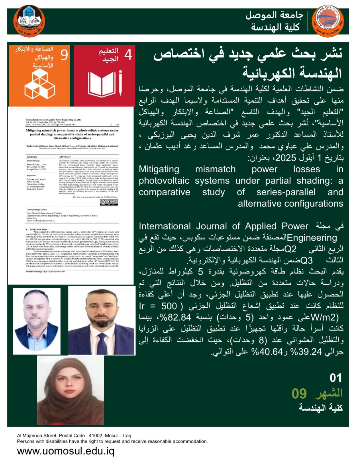 ناقشت كلية الهندسة / قسم الهندسة الكهربائية بجامعة الموصل رسالة ماجستير عن تصميم نظام ذكي لكشف وتحديد أنواع الأعطال في مزارع أنظمة الطاقة الشمسية ، [إقرأ المزيد]