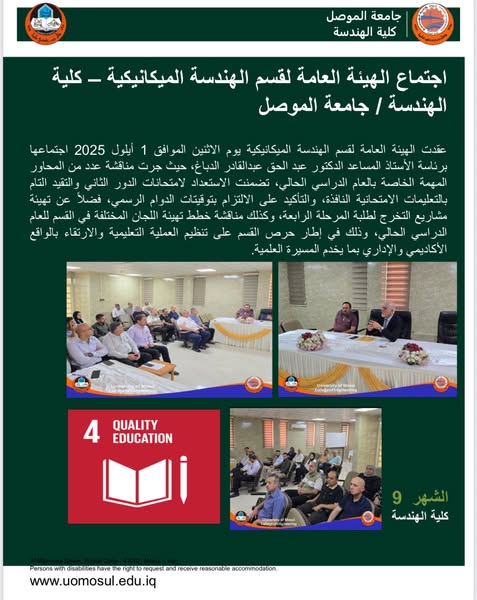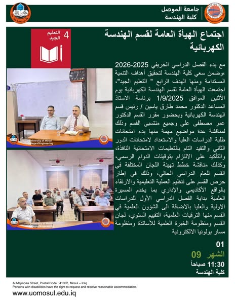 مع بدء الفصل الدراسي الخريفي 2025-2026 ،وضمن سعي كلية الهندسة لتحقيق أهداف التنمية المستدامة ومنها الهدف الرابع " التعليم الجيد"، اجتمعت الهيأة العامة لقسم الهندسة [إقرأ المزيد]