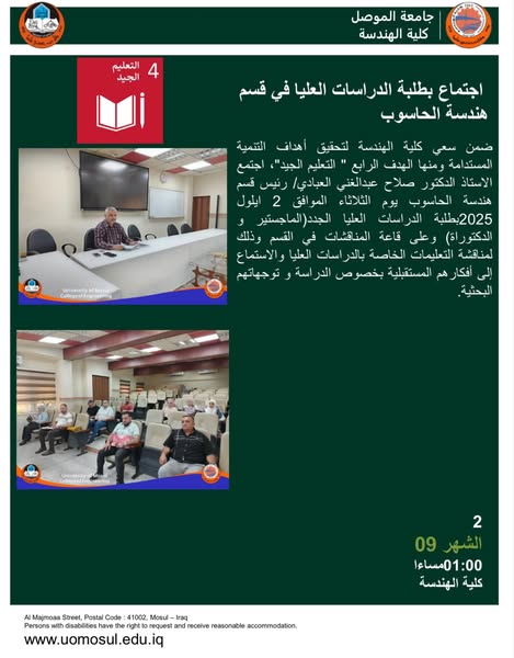 ضمن سعي كلية الهندسة لتحقيق أهداف التنمية المستدامة ومنها الهدف الرابع " التعليم الجيد"، اجتمع الاستاذ الدكتور صلاح عبدالغني العبادي/ رئيس قسم هندسة الحاسوب يوم [إقرأ المزيد]