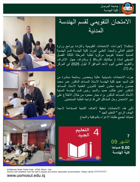 إستكمالا لإجراءات الامتحانات التقويمية والتزاما ببرامج وزارة التعليم العالي والبحث العلمي أجرت كلية الهندسة قسم الهندسة المدنية امتحانا تقويميا مركزيا لطلبة المرحلة الثالثة الفصل الصيفي [إقرأ المزيد]