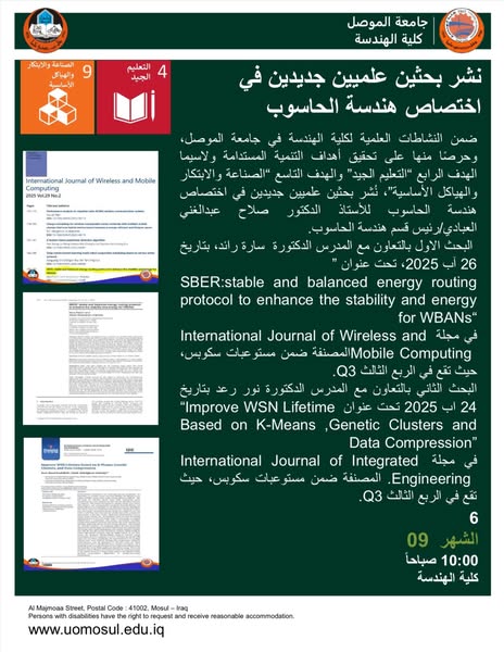 ضمن النشاطات العلمية لكلية الهندسة في جامعة الموصل، وحرصًا منها على تحقيق أهداف التنمية المستدامة ولاسيما الهدف الرابع "التعليم الجيد" والهدف التاسع "الصناعة والابتكار والهياكل [إقرأ المزيد]