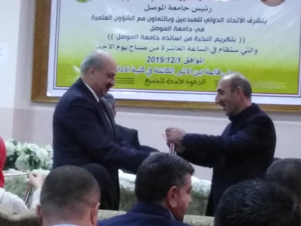 برعاية الأستاذ الدكتور (قصي كمال الدين الاحمدي) المحترم رئيس جامعة الموصل، قام الإتحاد الدولي للمبدعين فرع العراق بتكريم نخبة من تدريسي قسم الهندسة المدنية بوسام الإبداع تثمينا لنشاطهم العلمي المتميز ولحصولهم على براءات إختراع في مجال الإنشاءات والجيوتكنيك وهم كلا من:-