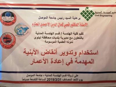 برعاية السيد رئيس جامعة الموصل (أ.د. قصي كمال الدين الأحمدي) المحترم وبحضور السيد عميد كلية الهندسة (أ.د. بيار جعفر السليفاني) المحترم والسادة المعاونيين ورؤساء الأقسام العلمية لكلية الهندسة.أقام قسم الهندسة المدنية وبالتعاون مع مديرية بلديات محافظة نينوى ندوته العلمية الثانية للعام الدراسي (2018-2019) والموسومة ب (استخدام وتدوير أنقاض الأبنية المهدمة في إعادة الإعمار) في يوم الأحد المصادف 31/3/2019 وعلى رحاب قاعة الإجتماعات في قسم الهندسة المدنية ، وبحضور (المهندس عبدالقادر الدخيل) مدير بلديات نينوى وممثلي عن دوائر محافظة نينوى المختلفة ونقابة المهندسين والقطاع الخاص.حيث تم إفتتاح الندوة بقراءة أيات من الذكر الحكيم تلاها قراءة سورة الفاتحة على أرواح شهداء الموصل والعراق ثم كلمة للسيد رئيس قسم الهندسة المدنية (أ.د. محمد نجم محمود) المحترم رحب فيها بالسادة الحضور ووضح الهدف من الندوة وأهم المحاور التي ستتم مناقشتها في الندوة ، تلاها كلمة للسيد مدير البلديات وضح فيها حجم الأضرار التي تعرضت لها مدينة الموصل في عمليات التحرير وبين الكميات التقريبية من مخلفات الأبنية المتضررة لمحافظة نينوى بصورة عامة ولمدينة الموصل بالخصوص.وتخلل الندوة تقديم درع الهندسة المدنية قدمه السيد عميد الكلية الى السيد رئيس الجامعة والسيد مدير البلديات ومجموعة من السادة المشاركين في الندوة بالإضافة الى تكريم موظفي قسم الهندسة المدنية المحالين الى التقاعد، تلاها إلقاء محاضرات لتدريسي قسم الهندسة المدنية وضحوا فيها كيفية الإستفادة من مخلفات الأبنية المتضررة في إعادة إعمار مدينة الموصل ولجميع إختصاصات الهندسة المدنية والمتمثلة بهندسة الإنشاءات والبناء والجيوتكنك وهندسة الطرق.