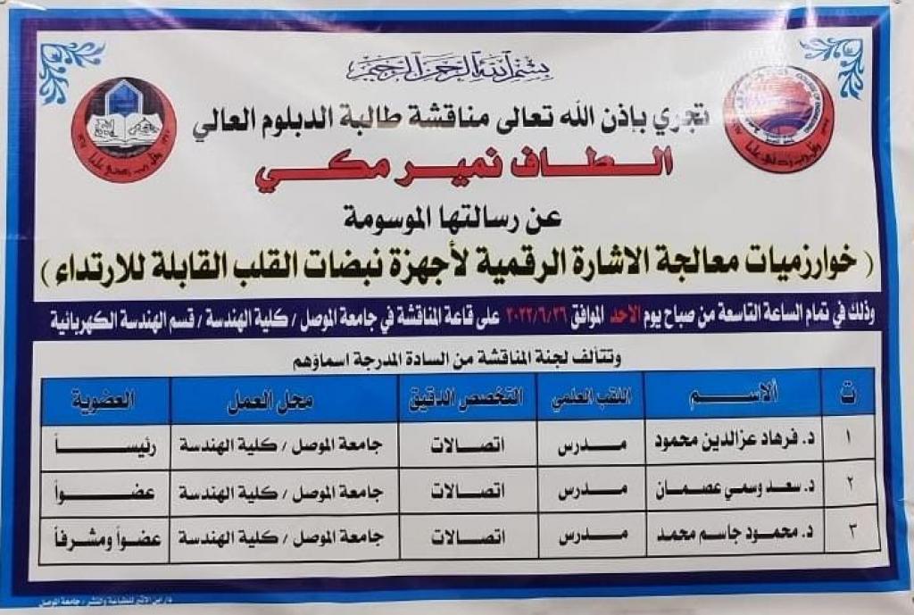 تمت مناقشة بحث للدبلوم العالي في قسم الهندسة الكهربائية بجامعة الموصل بعنوان “خوارزميات معالجة الاشارة الرقمية لاجهزة نبضات القلب القابلة للارتداء” للطالبة الطاف نمير مكي في تمام الساعة التاسعة من يوم الاحد الموافق 26/6/2022.تمت معالجة الاشارة الرقمية الناتجة عن كهربائية القلب بأستخدام خوارزميات متعددة وذلك للتخلص من الضوضاء المختلفة الممزوجة مع هذه الاشارة نتيجة النشاط البشري والاجهزة الكهربائية وعناصر التغذية الكهربائية، لذلك تمت دراسة انواع الضوضاء المختلفة والتي تؤثر على اشارة تخطيط القلب وكذلك عرض طرق تقليل هذه الضوضاء. واخيرا تم تصميم مرشحات رقمية فعالة لتمرير اشارة تخطيط القلب من خلالها للتخلص من هذه الضوضاء.هذا المشروع يبين دور المعالجة المسبقة بأستخدام الخوارزميات في تصفية مكونات الضوضاء وتقليلها مما يسهل تشخيص اضطرابات القلب المختلفة في الاجهزة المحمولة.تألفت لجنة المناقشة من الدكتور فرهاد عز الدين محمود رئيسا وعضوية كل من الدكتور سعد وسمي عصمان والدكتور محمود جاسم محمد عضوا ومشرفاً.وبعدها قرأ قرار لجنة المناقشة وتضمين قبول الرسالة مع منح الطالبة درجة الدبلوم العالي. مبارك للطالبة والقسم العلمي.