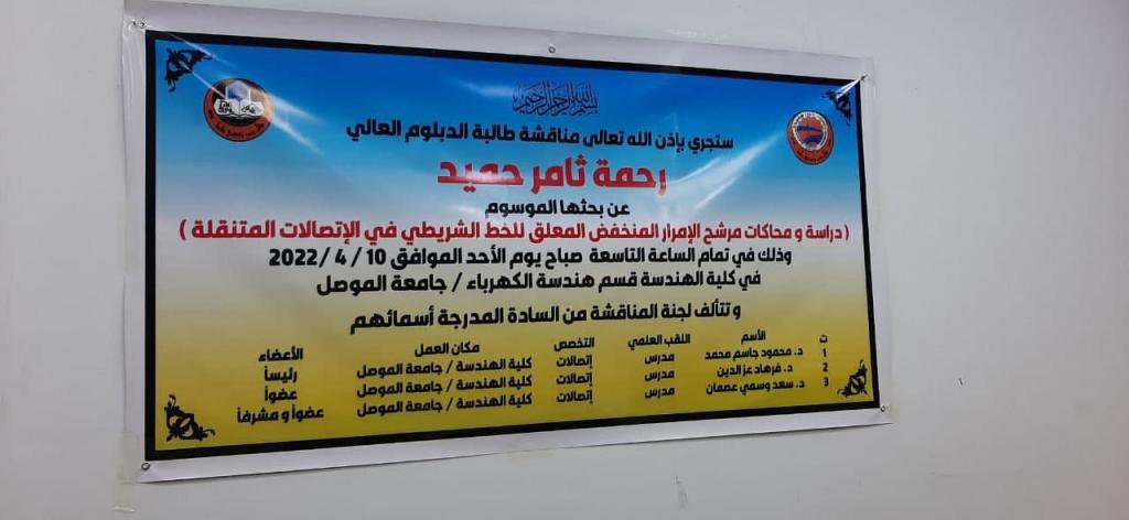 تمت مناقشة بحث الدبلوم العالي في قسم الهندسة الكهربائية بجامعة الموصل بعنوان “دراسة ومحاكاة مرشح إمرار المنخفض المعلق للخط الشريطي فـي الاتصالات المتنقلة” للطالبة رحمة ثامر حميد في تمام الساعة التاسعة من يوم الاحد الموافق 10/4/2022.