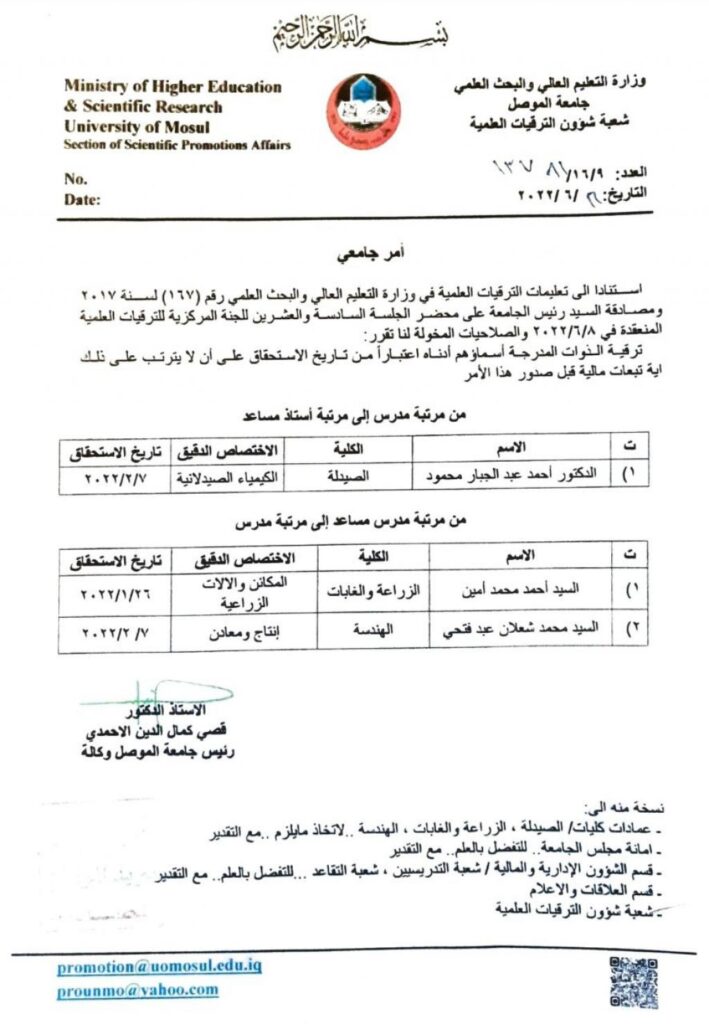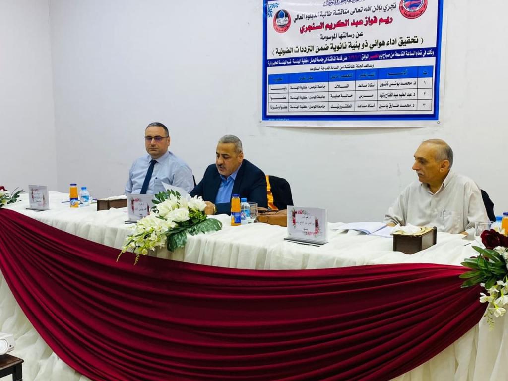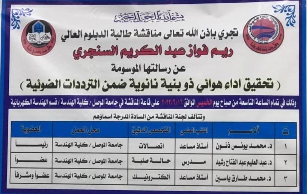 تمت مناقشة بحث دبلوم عالٍ في قسم الهندسة الكهربائية بجامعة الموصل بعنوان “تحقيق اداء هوائي ذو بنية نانوية ضمن الترددات الضوئية” للطالبة ريم فواز عبد الكريم في تمام الساعة التاسعة من يوم الخميس الموافق 16/6/2022.