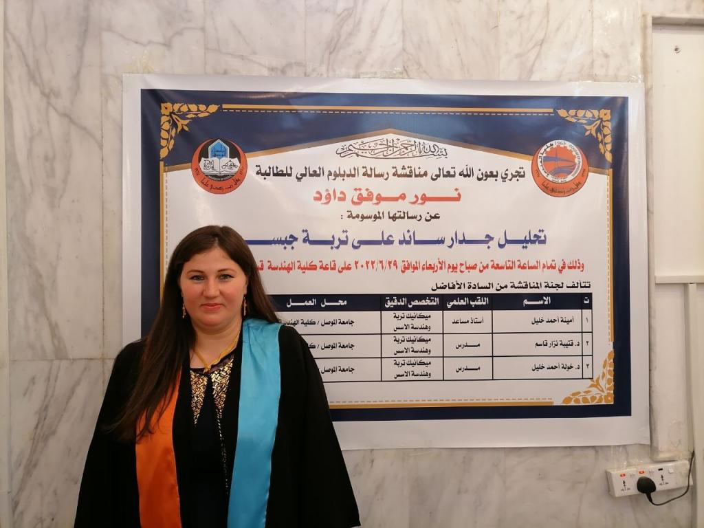 تمت مناقشة بحث التخرج لنيل شهادة الدبلوم العالي في قسم الهندسة المدنية بجامعة الموصل بعنوان “تحليل جدار ساند على تربة جبسية” للطالبة نور موفق داؤد في تمام الساعة التاسعة من يوم الاربعاء الموافق 29/06/2022.تضمن هذا البحث دراسة الضغط الجانبي للتربة على جدار ساند ناتئ مشيد على تربة جبسية، كما تضمن ايجاد الهبوط لهذه التربة الجبسية والذي تمت دراسته بثلاث حالات وهي هبوط سطح التربة الأفقي خلف الجدار الساند، الهبوط مع عمق الجدار الساند وتأثير الوقت على الهبوط. اخذت عدة عوامل بنظر الأعتبار لغرض الدراسة متمثلة بأرتفاع الجدار الساند، الأجهاد العمودي المسلط على سطح التربة، الأجهاد العمودي الجزئي، وتأثير المياه الجوفية بوجود وعدم وجود ارتشاح للمياه السطحية.تصنف التربة المستخدمة في البحث على أنها تربة جبسية بمحتوى جبسي 32%، غرينية واطئة اللدونة و تم اختيارها من منطقة الشركة العامة لصناعة الأسمدة في بيجي، كما استخدم برنامج GeoStudio (2012) لغرض التحليل.بينت النتائج أن الضغط الجانبي يقل مع زيادة ارتفاع الجدار الساند، كذلك فأن هبوط سطح التربة يزداد عند زيادة كل من ارتفاع الجدار الساند والوقت.ان هبوط التربة حيث يقل الهبوط عندما تزداد الأجهاد العمودي، ويتحول الى زيادة بحجم التربة في الأعماق القريبة من قاعدة الجدار الساند ، كما ان هبوط التربة يقل تحت تأثير الوقت كلما ازدادت المسافة الأفقية بين الجدار الساند وموقع تسليط الأجهاد العمودي الى ان يصبح زيادة بحجم التربة.تألفت لجنة المناقشة من الانسة أ.م. امينة احمد خليل رئيسا ود. قتيبة نزار الصفار عضوا ود. خولة احمد خليل عضواً ومشرفاً. وبعدها قرأ قرار لجنة المناقشة وتضمين قبول بحث التخرج مع منح الطالب درجة الدبلوم العالي.