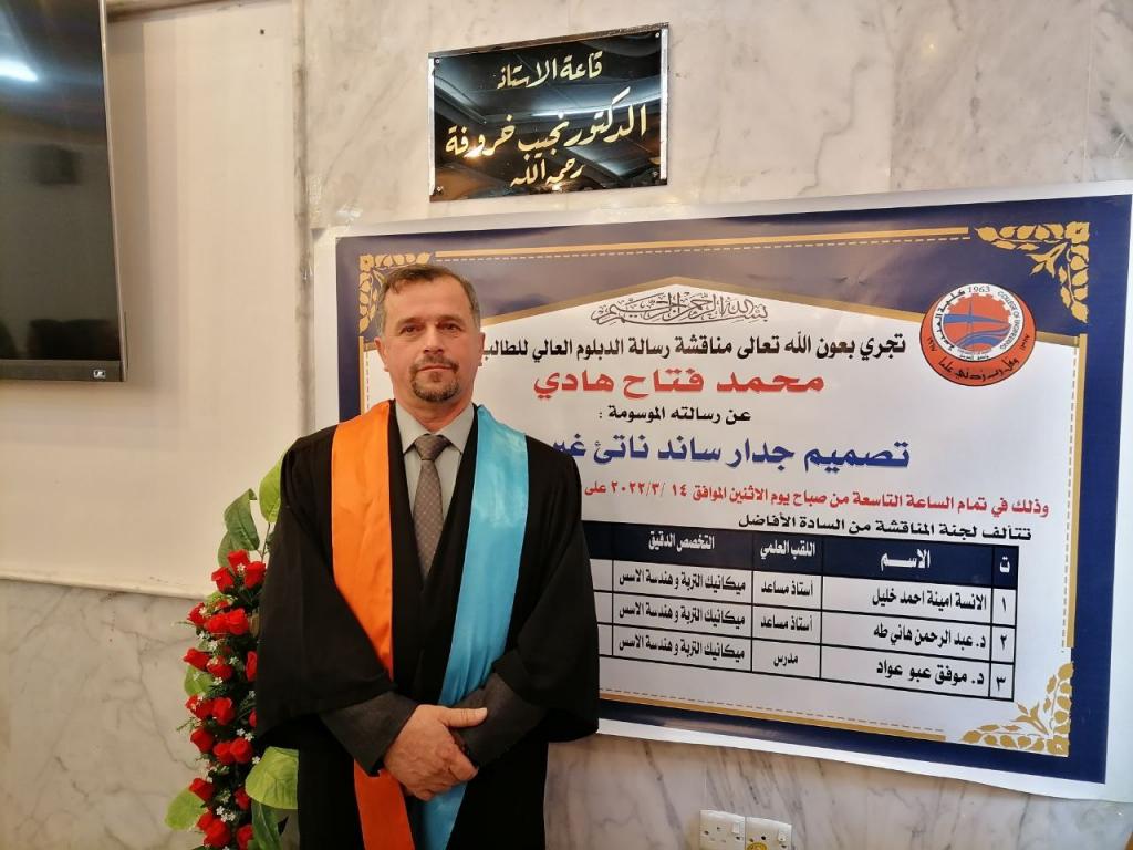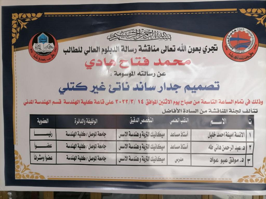 نوقش بحث للدبلوم العالي في قسم الهندسة المدنية بجامعة الموصل بعنوان ” تصميم جدار ساند ناتئ غير كتلي” للطالب محمد فتاح هادي في تمام الساعة التاسعة من يوم الاثنين الموافق 14/03/2022.