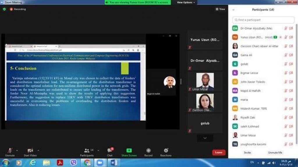شارك الدكتور عمر شرف الدين التدريسي في قسم الهندسة الكهربائية في كلية الهندسة بجامعة الموصل في اعمال المؤتمر الدولي الثالث للعلوم الهندسية والتقنيات المتقدمة (IICESAT) الذي عقدته كلية هندسة المواد في جامعة بابل وبالتعاون مع كلية الهندسة في المسيب، ونقابة الاكاديميين العراقيين فرع بابل في رحاب جامعة بابل للمدة 4-5 حزيران 2021. وهو مؤتمر تنشر بحوثه في مجلة IOP Journal of Physics: Conference Series, (Scopus Index) المصنفة ضمن مستوعبات سكوبس