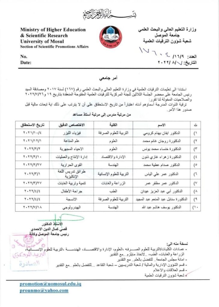 صدر وبالامر الجامعي المرقم ٩ / ١٦ / ١٧٦٠٤ بتاريخ ٧ / ٨ / ٢٠٢٢ ترقية علمية جديدة لمرتبة استاذ مساعد في كلية الهندسة / قسم الهندسة الميكانيكية، حيث تم ترقية التدريسي الدكتور صدام عطية محمد لمرتبة استاذ مساعد في اختصاص (القوى الحرارية).وبهذه المناسبة تتقدم اسرة كلية الهندسة بأسمى التهاني والتبريكات للتدريسي بمناسبة ترقيته وتتمنى له الموفقية والنجاح ومزيداً من العطاء خدمة لجامعتنا.