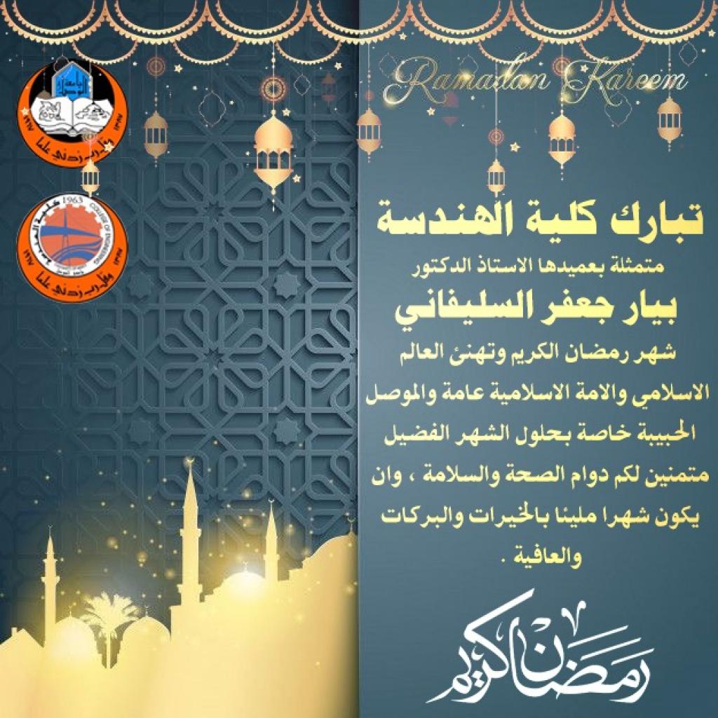 تتقدم كلية الهندسة متمثلة بعميدها الأستاذ الدكتور بيار جعفر السليفاني بازكى التهاني والتبريكات بمناسبة حلول شهر رمضان المبارك الى كل القيادات الجامعية والكوادر التدريسية والطلبة الاعزاء في جامعة الموصل عامة وفي كلية الهندسة خاصة. ونحن مقبلين على الشهر المبارك لا يسعنا الا نتمنى للامة الإسلامية جمعاء ان يهله علينا بالأمن والأيمان والعون على الصلاة والصيام وتلاوة القرآن ويمنحنا بركات روحية تلامس القلوب وسلاما يحل في القلوب ويستجيب لكل دعاء من اجل ان ينعم الله علينا بالصحة والعافية وأن يكلل أيامنا بالفرح والبهجة والمحبة ويعيده على الجميع بالسعادة والسلامة وأن يكتب النجاح والتفوق لأبنائنا الطلبة. وكل عام وأنتم بألف بخير.شعبة الاعلام والعلاقات العامة /كلية الهندسة